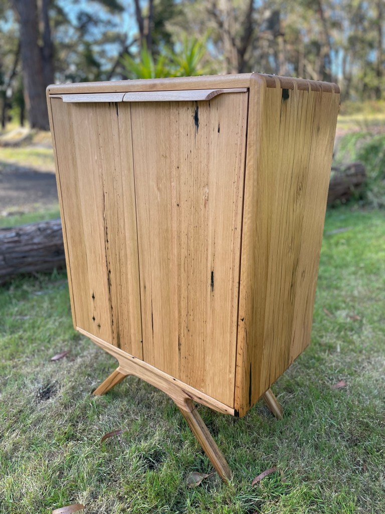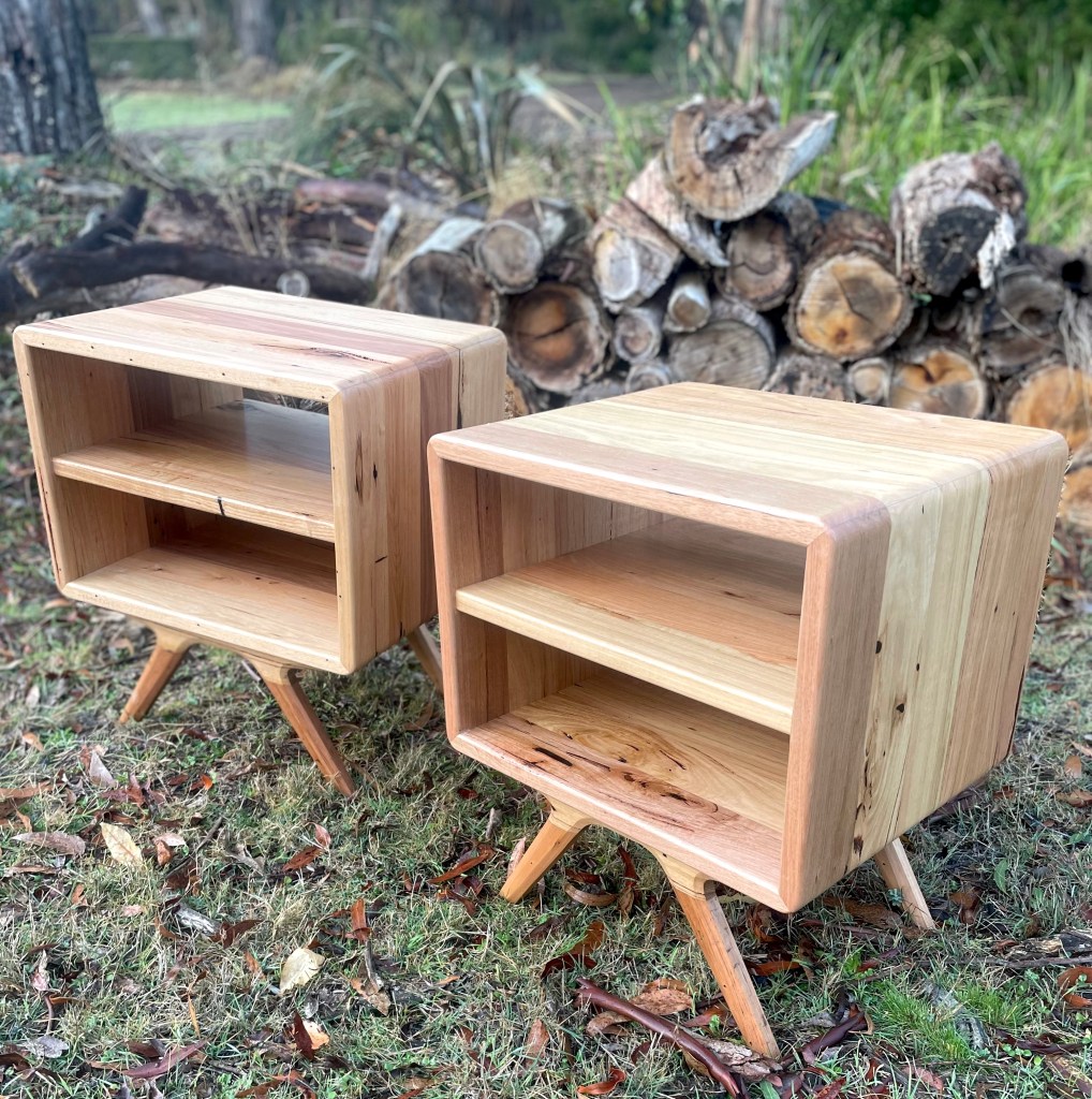 Elevate your bedroom with these stunning mid-century-inspired bedside cabinets, crafted from ethically and sustainably sourced recycled messmate timber. Showcasing the natural beauty of Australian hardwood, each unit is designed to combine timeless aesthetics with modern functionality.